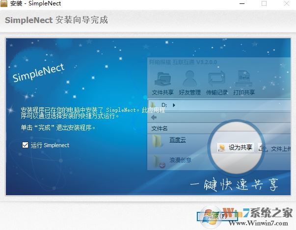 4、安裝完成,提示我們安裝程序已在您的電腦中安裝了SimpleNect 次應(yīng)用程序 點(diǎn)擊完成退出安裝。