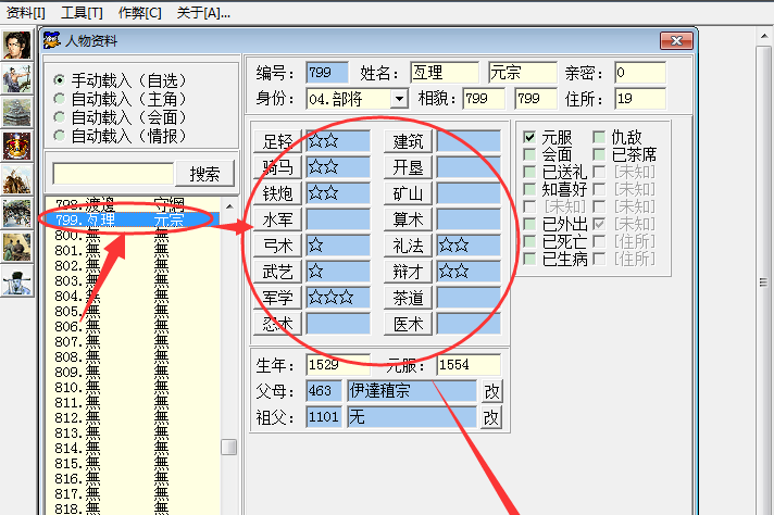 在屬性因子中,你可以修改軍事指揮官是否生病、死亡、外出、元服、見過(guò)面、送過(guò)禮物、喝過(guò)茶、知道他的喜好和敵人。