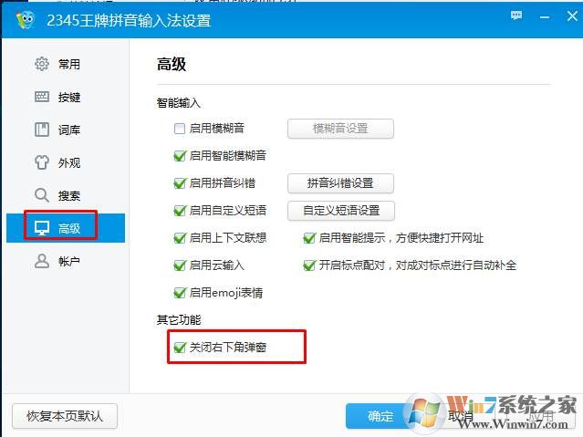 3、在高級(jí)選項(xiàng)中,把關(guān)閉右下角彈窗,勾選上。就可以了。