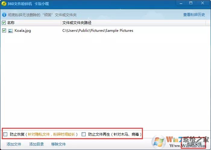 2、點(diǎn)擊“粉碎文件”。在選擇粉碎前還可以勾選防止恢復(fù)(針對(duì)隱私文件,粉碎時(shí)間較長)、防止文件再生(針對(duì)木馬、病毒),勾選后粉碎更徹底,不會(huì)恢復(fù)不會(huì)再生。