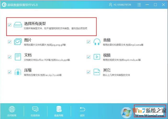 2、選擇我們需要掃描恢復的文件類型,當然全選是最好的。反正掃描恢復很快的,選中[掃描]即可。