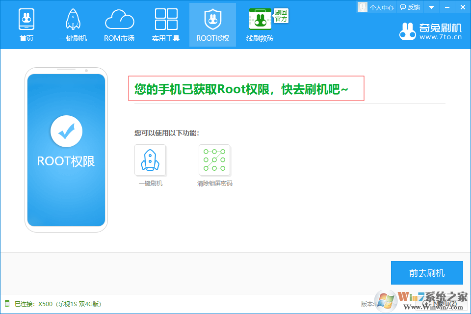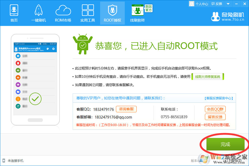 6、當手機重啟后,再次連接奇兔刷機,會看到ROOT授權(quán)提示已變成如下圖所示,則表示root成功。