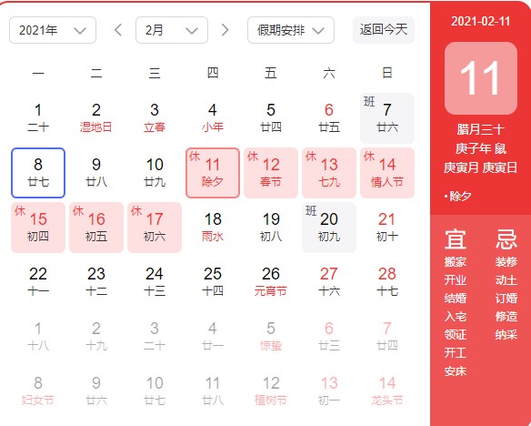 2021年春節(jié)是2月12號(hào),星期五 (辛丑年(牛年)正月初一。春節(jié)的放假安排是2月11日至17日放假調(diào)休,共7天。2月7日(星期日)、2月20日(星期六)上班,共7天。
