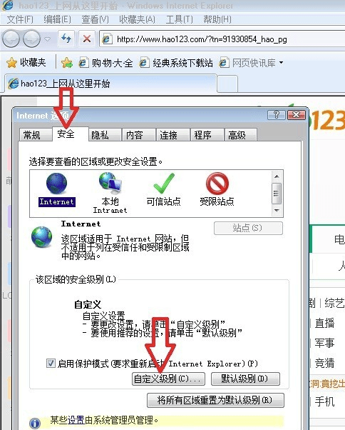 2、在ie8瀏覽器(Internet Explorer 8)“Internet 選項(xiàng)”界面選擇【安全】——【自定義級別】