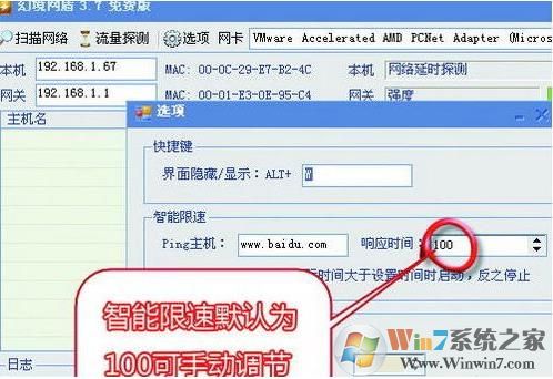 1、首次運(yùn)行幻境網(wǎng)盾會(huì)彈出一個(gè)“選項(xiàng)”設(shè)置窗口,這里可以設(shè)置界面隱藏快捷鍵、智能限速的設(shè)置、ARP防火墻等。智能限速的默認(rèn)響應(yīng)時(shí)間是100ms,對(duì)于懶人或者小菜鳥來(lái)說(shuō),直接使用默認(rèn)值就可以了。