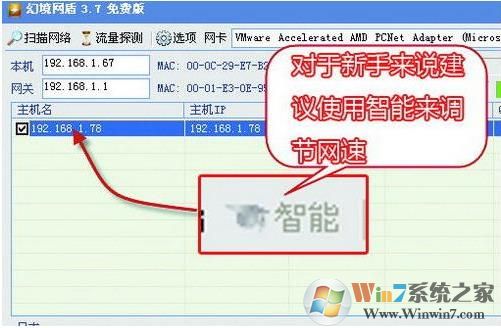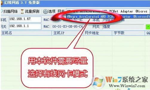 2、在主界面的“網(wǎng)卡”中,選擇接入局域網(wǎng)所用的網(wǎng)卡。如果同時(shí)可以使用無(wú)線連接和有線連接,那么建議在“網(wǎng)卡”中選擇有線網(wǎng)卡,而不要使用無(wú)線網(wǎng)卡,這點(diǎn)請(qǐng)大家記住了。因?yàn)橐暵酚善鞑煌镁尘W(wǎng)盾使用無(wú)線網(wǎng)卡可能根本無(wú)法控制別人的網(wǎng)速。
