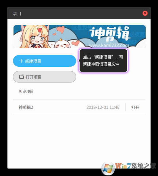 ①、雙擊電腦桌面的神剪輯圖標,打開軟件,在彈出的“項目”面板中,點擊新建項目,如圖1所示。