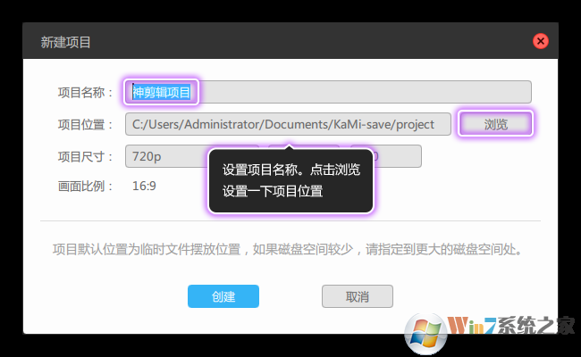 ②、在“新建項目”面板中,修改一下項目名稱,按自己的喜好來,再點擊“瀏覽”設(shè)置一下項目位置,如圖2所示。