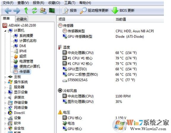 找到左側(cè)的菜單欄中的計算機,然后在計算機下面找到傳感器,這個時候點擊傳感器,過一會就會彈出檢測的情況,如左側(cè)的溫度列表。