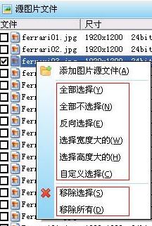 4、在左側(cè)列表中使用鼠標(biāo)點(diǎn)擊鉤選需要轉(zhuǎn)換的圖片文件,也可以使用主菜單〖操作〗中的菜單項(xiàng)或鼠標(biāo)右鍵菜單項(xiàng)進(jìn)行選取,菜單項(xiàng)包括:全部選擇、全部不選擇、反向選擇、選擇寬度大的、選擇高度大的、自定義選擇,使用〖自定義選擇〗菜單項(xiàng)可以按照?qǐng)D片的格式、尺寸進(jìn)行圖片選取。