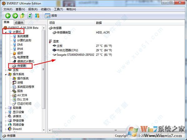 還是在“計(jì)算機(jī)”里,點(diǎn)擊“傳感器”即可詳細(xì)顯示主板、CPU、硬盤的溫度及CPU的電壓。非常方便!其實(shí)我用此版本的EVEREST Ultimate Edition 時(shí)候,這些溫度在電腦的任務(wù)欄有顯示的!