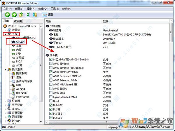通過查看指令集可以判斷自己的CPU是否大強(qiáng)。其實(shí)是支持的指令越多,代表你的CPU越好。這些查看電腦硬件信息的菜單我就不多說了,大家可以自己點(diǎn)擊菜單里的選項(xiàng)去慢慢查看。