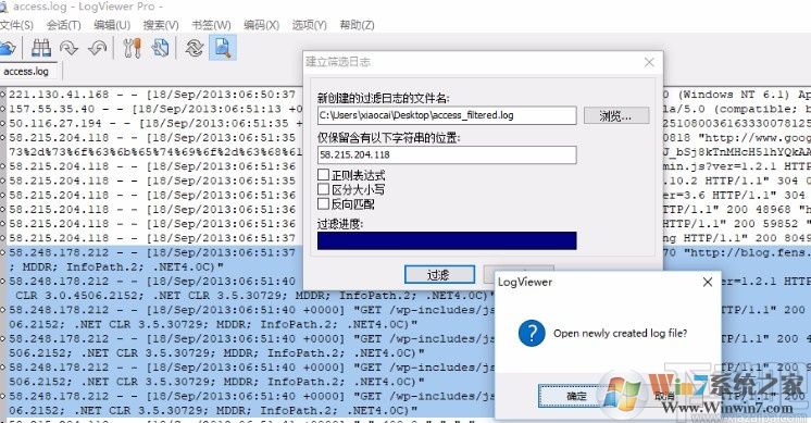 4.點(diǎn)擊過濾日志的話會(huì)出現(xiàn)下圖所示的界面,設(shè)置好篩選日志的參數(shù)之后點(diǎn)擊過濾按鈕,接著在出現(xiàn)的窗口中點(diǎn)擊確定按鈕即可。