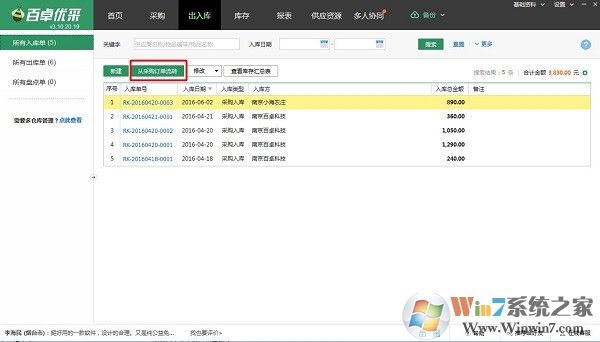 2、點擊“從采購訂單流轉(zhuǎn)“按鈕,在選擇采購訂單彈層選擇需入庫的采購訂單,打開入庫單頁后,填寫實際需入庫的數(shù)量即可。