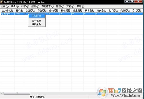 1、Attach to san10后可進(jìn)行內(nèi)存修改,以主角金錢為例。在編輯-主角信息中我們找到了主角的人物。接下來(lái)就是萬(wàn)惡的修改啦。右鍵單擊人物的那一行,選多項(xiàng)修改。