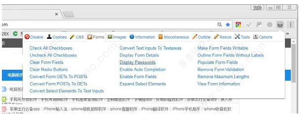 可以暫時(shí)的屏蔽當(dāng)前頁(yè)面中的某些東東,如Ja vaScript腳本、緩存、mete自動(dòng)重新定向、將網(wǎng)頁(yè)顯示為黑色(圖片除外)、禁用彈窗等。