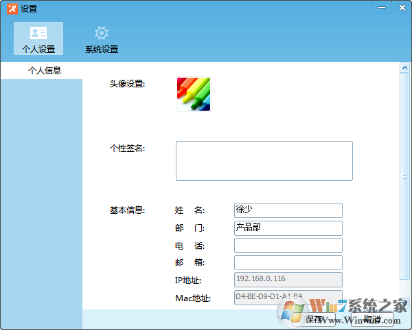 通過(guò)“個(gè)人設(shè)置”,用戶可以自定義頭像、修改簽名、姓名、部門(mén)等信息,點(diǎn)擊保存后,局域網(wǎng)用戶可以查看到您設(shè)置的信息。