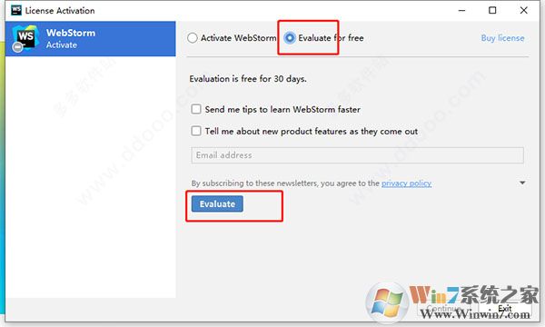 7、首次運行軟件會讓用戶配置或?qū)朐O(shè)置、選擇主題,這些用戶都可以隨意設(shè)置,到注冊界面時,請選擇evaluate for free,點擊evaluate試用軟件;