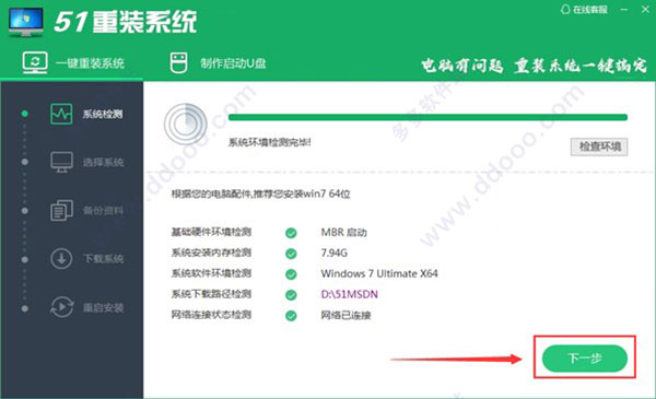 下載軟件完軟件后正常打開,程序會默認檢測當前系統(tǒng)環(huán)境,檢測完成后,點擊“下一步”。