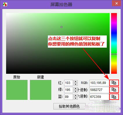 有“RGB”、“十進(jìn)制”、“十六進(jìn)制”三種方式可選,點(diǎn)擊這三種方式右邊的復(fù)制按鈕,即可將相應(yīng)數(shù)值復(fù)制到剪貼板了