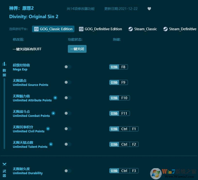3、運(yùn)行“神界:原罪2”游戲4、游戲運(yùn)行后點(diǎn)擊“加個(gè)Buff"按鈕,當(dāng)然大家也可以進(jìn)行單項(xiàng)修改