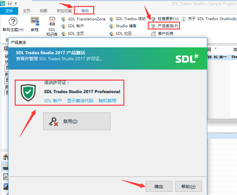 12、這樣設(shè)置后,我們就進(jìn)入了Trados2017中文版,我們可以通過點(diǎn)擊菜單欄的“幫助”-“產(chǎn)品激活”來查看Trados2017中文版的注冊激活狀態(tài)。