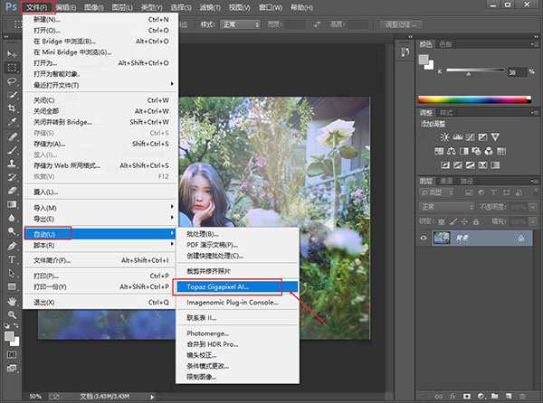 然后在PS菜單的“文件”——“自動(dòng)”——“Topaz Gigapixel AI”即可調(diào)用軟件,如下圖所示: