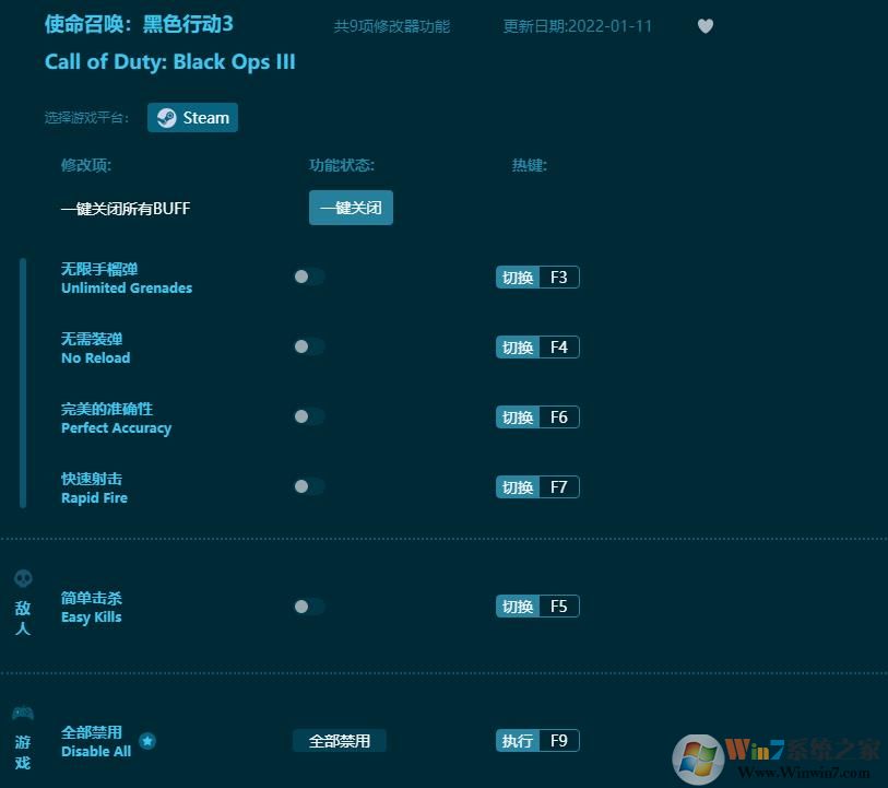 以上便是winwin7下載小編給大家分享介紹的使命召喚12黑色行動(dòng)3九項(xiàng)修改器,對(duì)廣大喜歡玩“使命召喚12:黑色行動(dòng)3”的游戲玩家來(lái)說(shuō)是非常不錯(cuò)的一個(gè)選擇!
