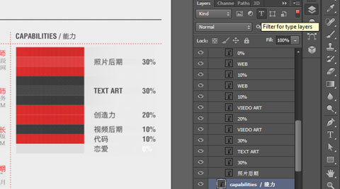 就拿截圖舉例,這是簡(jiǎn)歷,當(dāng)我需要更改一下 Capabilities 這一個(gè)組的文字的時(shí)候,或者我需要批量選取他們,微調(diào)一下位置,我該怎么辦呢?把組展開,然后按住 Ctrl 用鼠標(biāo)一個(gè)一個(gè)點(diǎn)?是的,在以前的版本里我們只能這樣做,不過,這在 CS6 里邊將會(huì)變得異常簡(jiǎn)單,「圖層面板」多了一個(gè)篩選功能,它可以按照「Kind(類型)」, 「Name(名稱)」, 「Effect(效果)」, 「Mode(模式)」, 「Attribute(屬性)」 ,「Color(顏色)」這些來篩選顯示的圖層。