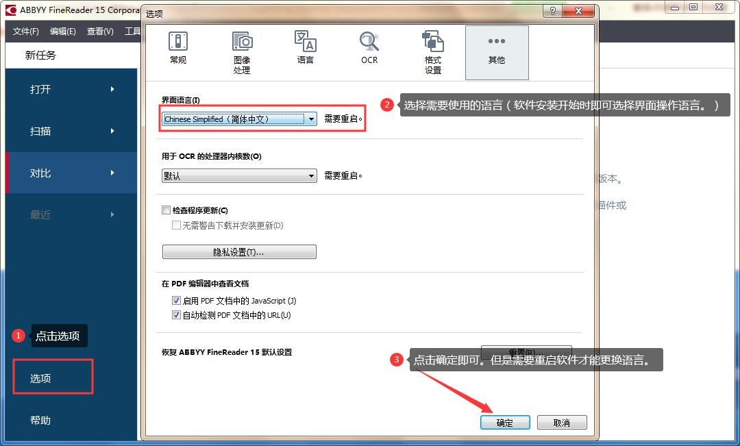 點擊“選項”--“其他”--“界面語言”選擇需要的語言即可。PS:語言設(shè)置完成后,需要重啟軟件界面語言才會生效。如圖