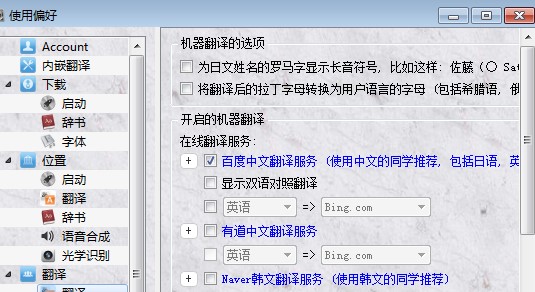 這里的翻譯選項(xiàng)先只選擇百度中文翻譯,其余翻譯全部關(guān)閉,翻譯越多程序越卡。然后語(yǔ)音合成選擇關(guān)閉。
