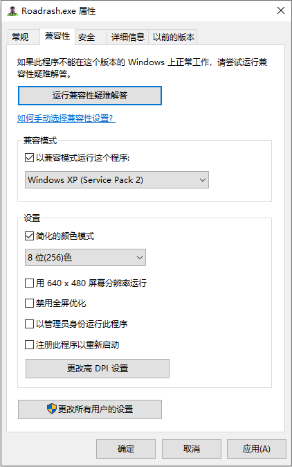 屬性對話框中的選項(xiàng),勾選“以兼容模式運(yùn)行這個(gè)程序”,以及“用256色運(yùn)行”