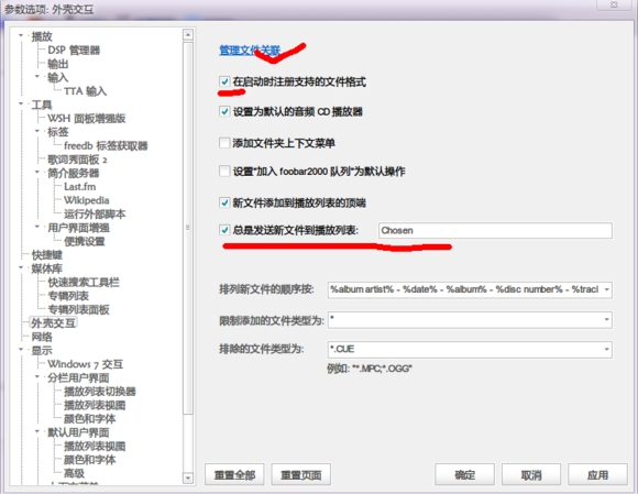 〓6.文件關(guān)聯(lián)設(shè)置:文件關(guān)聯(lián)是指將各格式的音樂文件(mp3,aac,flac,ape,cue,tak,wav,wma等)關(guān)聯(lián)到你那個(gè)foobar上,就是雙擊音樂文件后是用那個(gè)foobar打開的,那個(gè)音樂文件也是foobar的關(guān)聯(lián)圖標(biāo)(我會(huì)分享一些好看的關(guān)聯(lián)圖標(biāo))