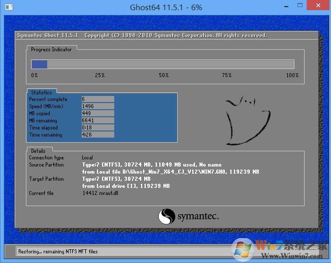 6、安裝系統(tǒng),即開(kāi)始恢復(fù)GHO文件到系統(tǒng),