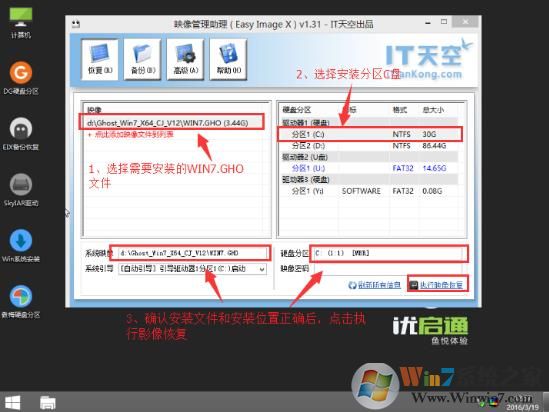找到WIN8PE桌面的EasyImageX并雙擊打開(kāi),然后選擇解壓好的WINDOWS7.GHO文件,安裝到自己想要存放系統(tǒng)的硬盤(pán)(一般用戶喜歡放C盤(pán)),確認(rèn)選擇的安裝文件和安裝分區(qū)正確后,點(diǎn)擊執(zhí)行映像恢復(fù),如下圖所示: