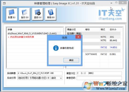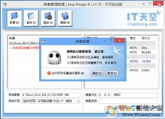 EasyImage再次提示檢查安裝文件和安裝分區(qū)的正確性,避免錯(cuò)誤,確認(rèn)無(wú)誤后,選擇確定,開(kāi)始恢復(fù)WINDOWS7.GHO,如下圖所示: