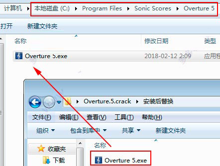 5、將【安裝后替換】目錄下的【Overture 5.exe】復(fù)制到安裝目錄下載覆蓋,默認(rèn)安裝目錄為【C:\Program Files\Sonic Scores\Overture 5】,如WinWin7小編分享的圖片: