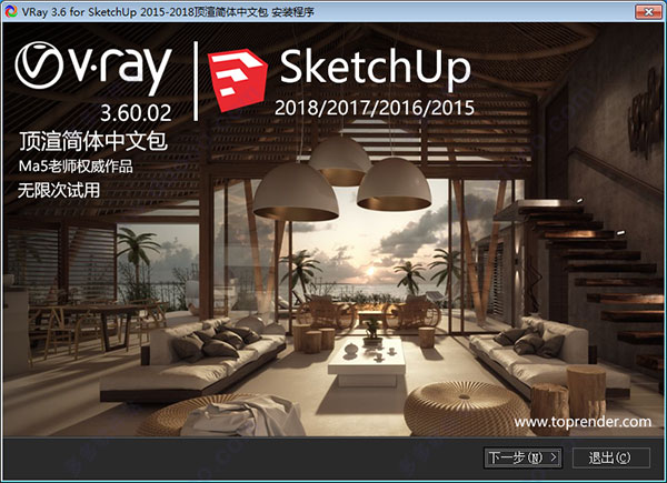 下面點(diǎn)擊“VRay 3.60.02 for SketchUp 2015-2018頂渲簡體中文包.exe”安裝