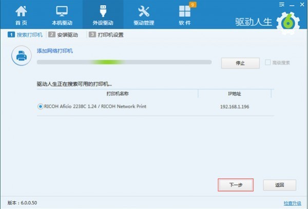 第一步,搜索打印機(jī),搜索局域網(wǎng)內(nèi)的打印機(jī)設(shè)備。只要打印機(jī)在局域網(wǎng)內(nèi),驅(qū)動人生就可以搜索到打印機(jī)設(shè)備的名稱。搜索到打印機(jī)后,點(diǎn)擊下一步。