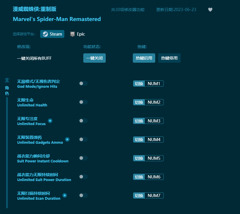 漫威蜘蛛俠重制版修改器功能介紹: