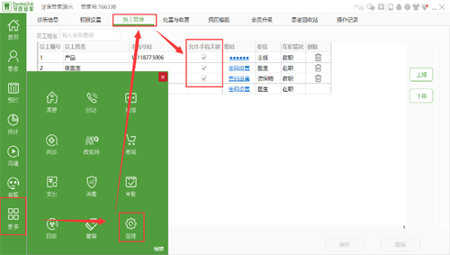 1、下載好手機端牙醫(yī)管家并注冊賬號之后,需確認是否有關(guān)聯(lián)手機的權(quán)限(點擊更多---管理---員工管理---允許手機關(guān)聯(lián))。如沒有勾選該選項,則賬號無法關(guān)聯(lián)手機端。