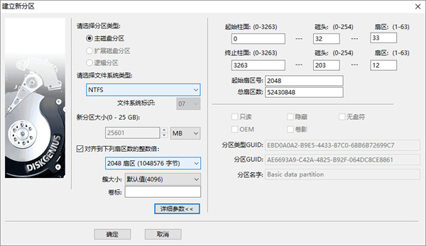對于GUID分區(qū)表格式,還可以設(shè)置新分區(qū)的更多屬性。設(shè)置完參數(shù)后點擊“確定”即可按指定的參數(shù)建立分區(qū)。