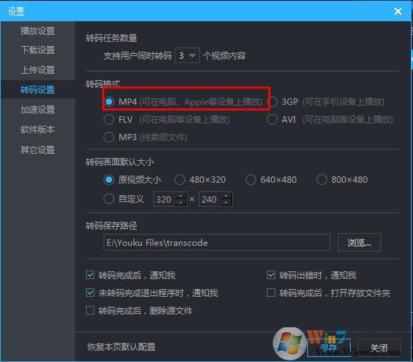 3、在轉(zhuǎn)碼中設(shè)置要轉(zhuǎn)換的視頻格式,MP4格式可以在電腦和手機(jī)中播放;