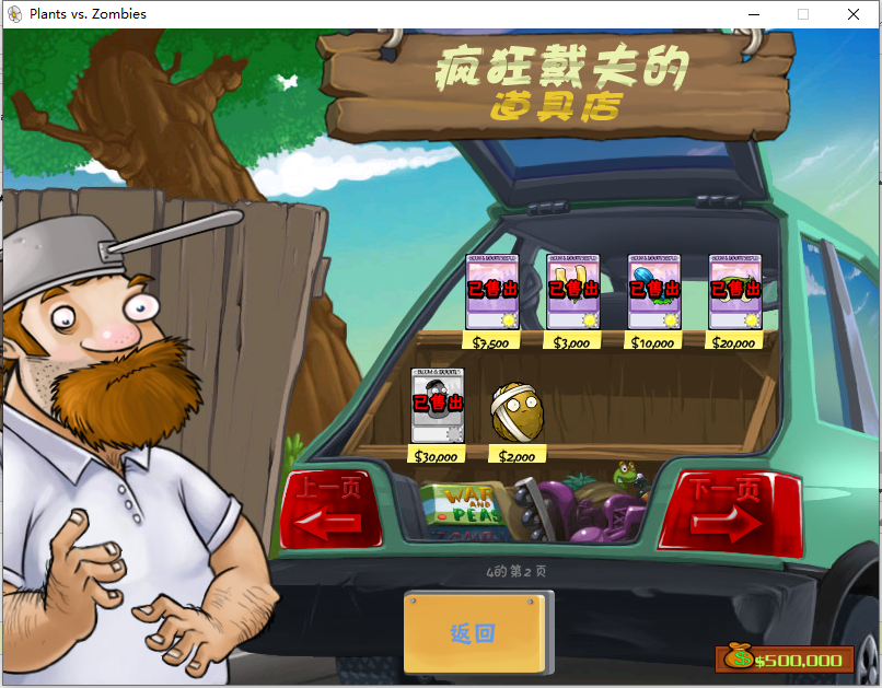 5、在瘋狂戴夫的道具店里,能購買的植物都已售出,且贈送金幣50W;