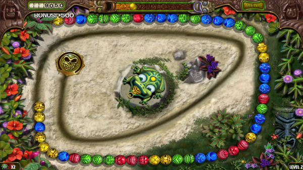阻止彩珠列進(jìn)入關(guān)卡內(nèi)的骷髏洞穴,當(dāng)彩珠進(jìn)入骷髏洞穴時(shí)祖瑪生命值減一,生命值歸零時(shí)候游戲結(jié)束。