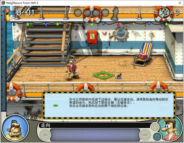 通關(guān)流程:首先等鄰居離開(kāi)左下,到左下,拿毯子,直接到右下把毯子鋪在艙口上,回左下,還有信號(hào)彈要撿→然后等鄰居離開(kāi)左上,到左上,等→鄰居離開(kāi)右中,到右中,撿玻璃碎片,地毯下有密碼紙,包里有安眠藥,等→鄰居離開(kāi)右下,到右下,用玻璃碎片把貨物架的掉繩割開(kāi)→到左上等待,等鄰居離開(kāi)右中,馬上走到右中的樓梯口等待,把握時(shí)機(jī),等鄰居快要中圈套時(shí)向下走,走到時(shí)鄰居應(yīng)該已經(jīng)離開(kāi)右下,立即撿起魚(yú)往右上跑→然后上樓梯的時(shí)候就選中魚(yú),然后對(duì)左上的花盆使用,使用完后馬上往回走,選中右的椅子躲藏(這個(gè)一定要快,否則會(huì)被鄰居他媽踢)→等鄰居離開(kāi)右中,老母睡著,馬上沖到左下,在水桶上放魚(yú),拿毛巾,迅速返回右中,再到左上,對(duì)臟的玻璃墻用毛巾,然后撿鸚鵡身上的鑰匙→回右中,把信號(hào)彈裝上,到躺椅躲藏→鄰居被整離開(kāi)右中,在船長(zhǎng)室使用安眠藥和密碼紙,回到躺椅,恭喜,你通關(guān)了~