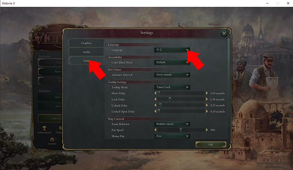 5、點(diǎn)擊點(diǎn)擊左側(cè)的game選項(xiàng),并找到Language選項(xiàng)并設(shè)置為簡(jiǎn)體中文并保存修改(修改語(yǔ)言后需重啟才可生效)