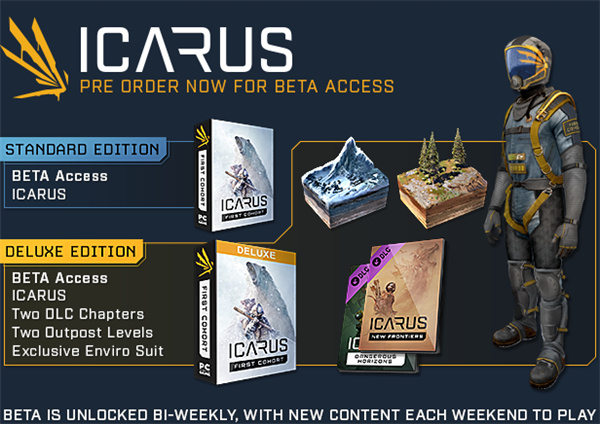 Icarus是個暴躁莫名的星球,從有毒的大氣到野蠻的野生動物和毀滅性風暴。無論是建造庇護所、尋找氧氣來源、狩獵下一頓餐食或是為長途跋涉儲備物資,準備和計劃就是一切。