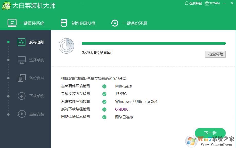 1、第一步,打開大白菜重裝系統(tǒng)軟件,然后會出現(xiàn)自動檢測系統(tǒng)環(huán)境,檢測完畢后點擊下一步;