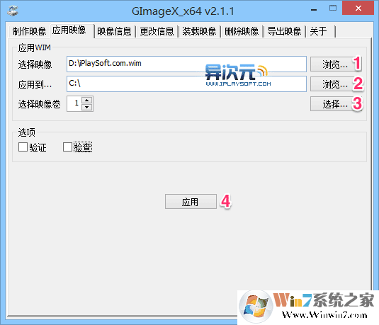 接下來,只需選擇“應(yīng)用映像”,打開 .wim 格式的備份文件[1],選擇恢復(fù)到系統(tǒng)盤的路徑[2],然后按[3]可以選擇要恢復(fù)的版本,如下:
